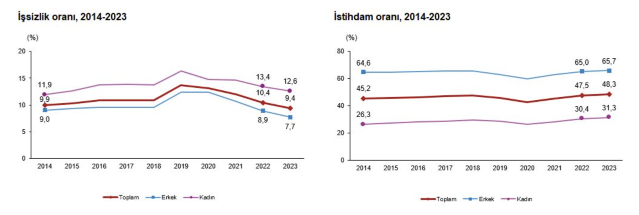 Tablo 1 ve 2: TÜİK verilerine göre 2014-2023 yılları arasında işsizlik ve istihdam oranları. Kaynak: https://data.tuik.gov.tr/Bulten/Index?P=Isgucu-Istatistikleri-2023-53521