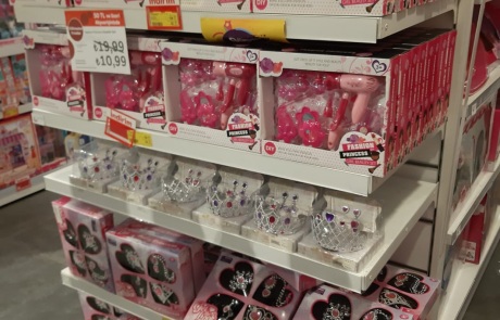 Bunun gibi “IsabelAbbey” mağazasındaki oyuncaklarında aynı şekilde kategorileştiğini gördük. Aynı zamanda dikkatimizi çeken diğer nokta ise erkeklere yönelik tasarlanan oyuncakların “silah, kılıç, kalkan, tabanca” gibi şiddet eğilimini arttıracak aletlerin ‘masumlaştırılmış’ biçimde vücut bulduğunu gördük. Kız çocuklarında ise durumlar tam aksine “taç, makyaj malzemeleri, ütü, çamaşır makinesi, bebek” gibi kadınsı yönlerinin baskınlaşmasına yönelik kodlama yapacak aletlere odaklandığına şahit olduk. Ve yine boyama ve hikaye kitaplarını incelediğimizde; kız çocukları kullanımına sunulan kitaplarda “prenses” figürü ön plandayken, erkeklerde ise ‘süper kahraman’ konulu kitaplar söz konusuydu.